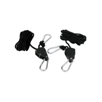Soportan hasta 5 kilos cada una de ellas (se venden por pares) con una longitud máxima de 1.05m. Son muy similares a las poleas con freno Pro grip pero aguantan menos peso, puesto que sustituye el mosquetón metálico por ganchos de plástico y la maroma de nylon por cuerda. Perfectas para reflectores abiertos, cooltubes, extractores de bajo peso.