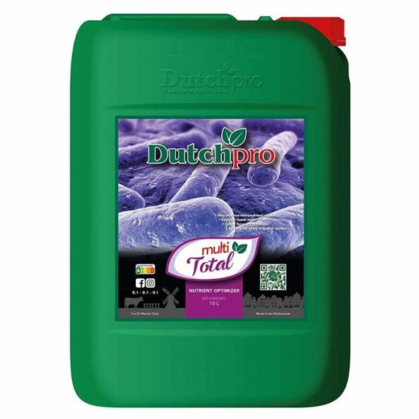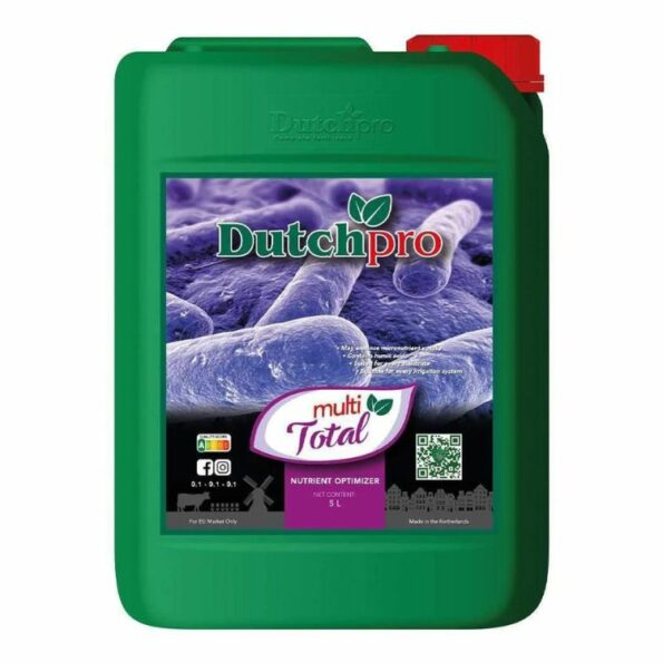 El Dutchpro Multi Total es un aditivo potente y multifuncional diseñado para optimizar la salud de la zona radicular y la absorción general de nutrientes en las plantas. Se le considera más que un simple aditivo enzimático, actuando como un optimizador del sustrato o «acondicionador de suelo».